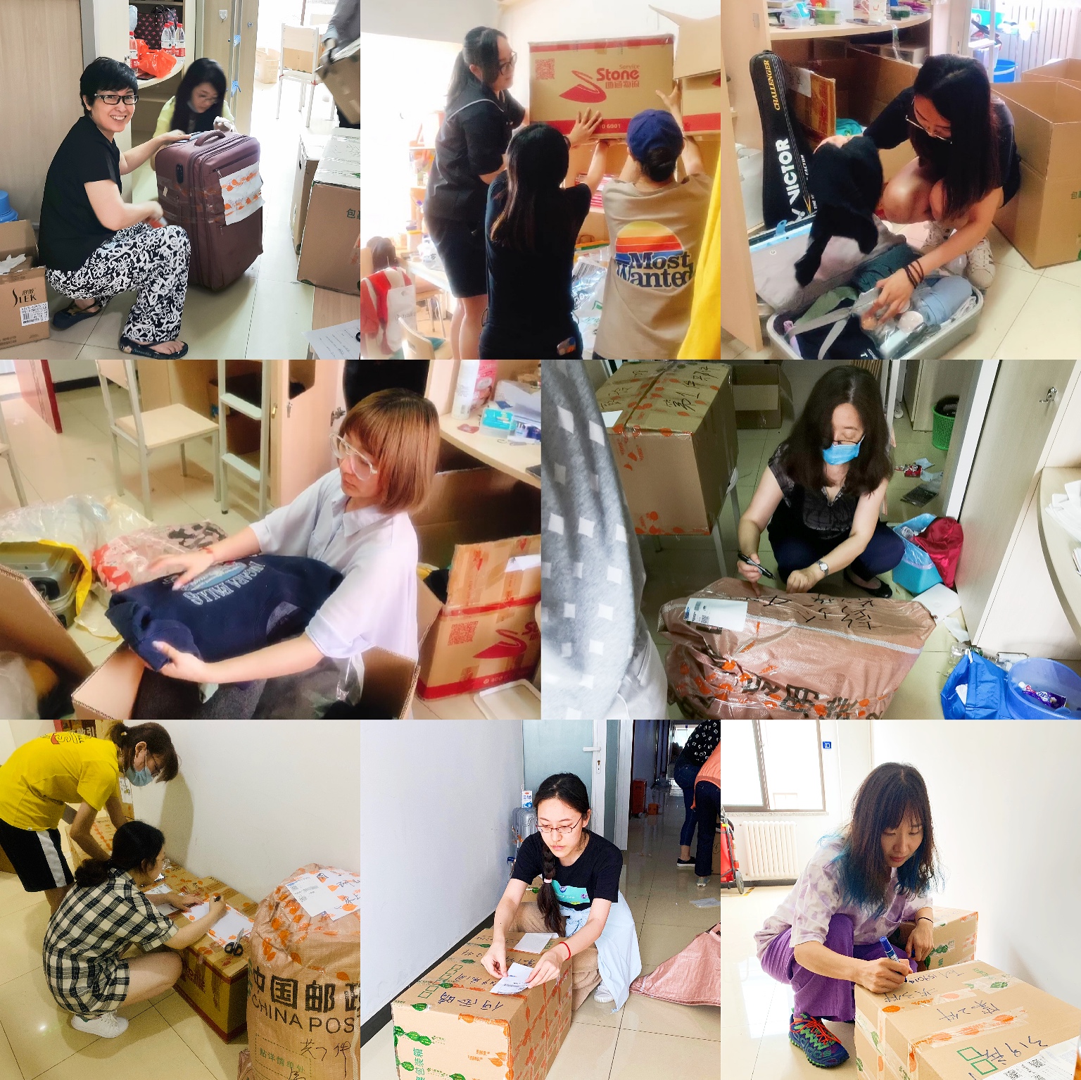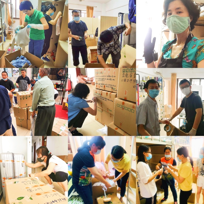 看似简单的打包工作却展现出了浓浓的师生情、同学情。在打包邮寄的过程中,受到网络条件的制约,加上时间间隔已久,同学们对于自己物品的记忆难免有些模糊,有时在封箱后,同学才想起来自己还有物品需要打包,但当同学们得知自己的行李已经封箱装车之后,除非有贵重物品遗漏,都表示不愿再麻烦老师学开包重打。每当这时,几乎所有老师都会毫不犹豫的取回学生遗漏的物品,拆开封好的箱子再一次进行打包,希望尽可能减小同学的损失。炎炎夏日,同学与老师之间的互相理解、互相体谅却好像一缕清风,足以将工作的疲惫一扫而空。