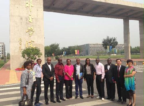 上午9点,肯尼亚青年外交官访华团一行10人在外交部非洲司李宇亮副处长等中方秘书的陪同下,乘车抵达沙河校区,非洲研究中心主任唐晓教授和外办袁莉副主任在大门口迎接。唐晓主任和袁莉副主任向代表团一行表示热烈欢迎,并带领大家首先参观了沙河新校区,肯尼亚青年外交官们对新校区崭新而完备的基础设施建设和优美宁静的校园环境表示赞许,并高兴地在温家宝总理题词“中国外交官的摇篮”碑前合影留念。