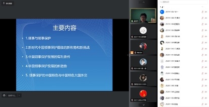 2022年1月13日晚,外交学系空中课堂系列讲座“中国领事保护与中国特色大国外交”在腾讯会议上圆满举行。本次讲座的主讲嘉宾为外交学系教授夏莉萍老师,由系党总支书记郭延凯老师主持,一百余名同学参加了本次讲座。在讲座中,夏老师条理清晰、生动形象的解说使聆听讲座的同学们受益匪浅、收获颇丰。
