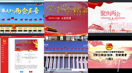 各班团支部采取了学习两会制度、收看十三届全国人大五次会议和全国政协十三届五次会议开幕盛况、聆听国务院总理李克强作的政府工作报告、了解全国人大代表的议案和全国政协委员的提案、交流和分享学习感悟等多样的团课活动形式,这对同学们进一步了解两会制度、认识两会意义具有重要作用。