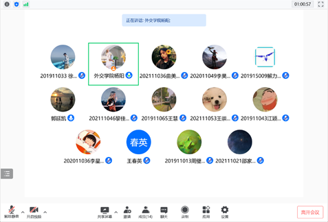 杨阳老师组织11位同学依次讲述了本城市、本小区的疫情防控情况和自身居家生活状况和线上学习情况。通过介绍,得知除部分同学身处封控区足不出户外,我系两地学生及家属均身体健康,并且都处于物资充沛、生活安定的状态。此外,通过交流,部分同学也提出了何时恢复线下教学及近期四六级考试如何安排等关心的问题。