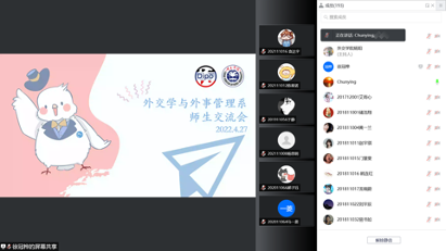 2022年4月27日晚,为更好解答同学们疫情居家条件下生活和学习上的问题,外交学系在腾讯会议线上平台成功举办了师生交流会。参加本次会议的有外交学系系主任王春英老师、外交学系党总支书记郭延凯老师、外交学教研室主任樊超老师、政治学与公共管理教研室主任杨晖老师、公共外交教研室主任陈雪飞老师、政治学与公共管理教研室主任牛仲君老师、中国对外关系教研室主任陈涛老师、辅导员杨阳老师、教秘黄迪老师以及全系两百多位同学。