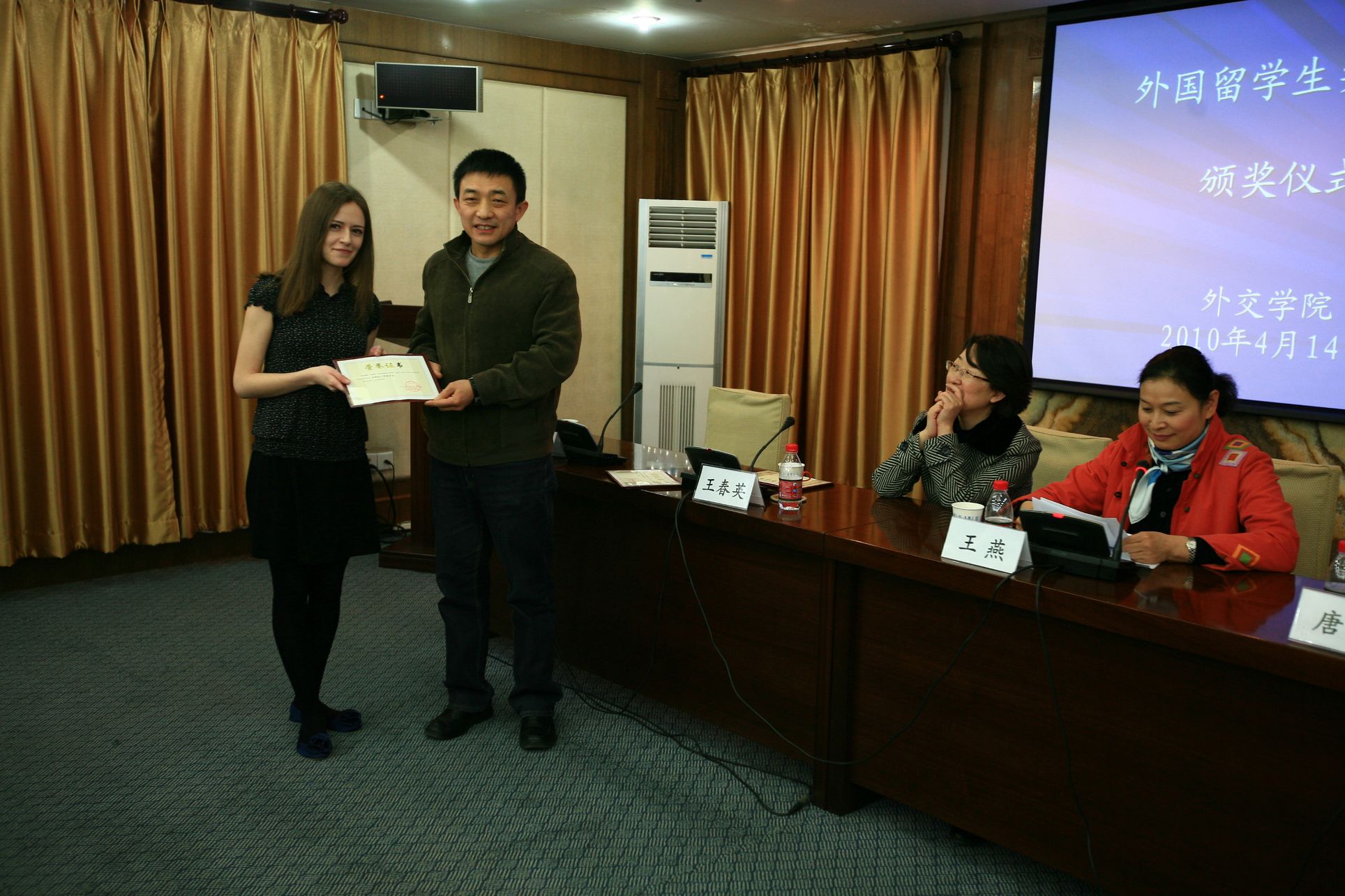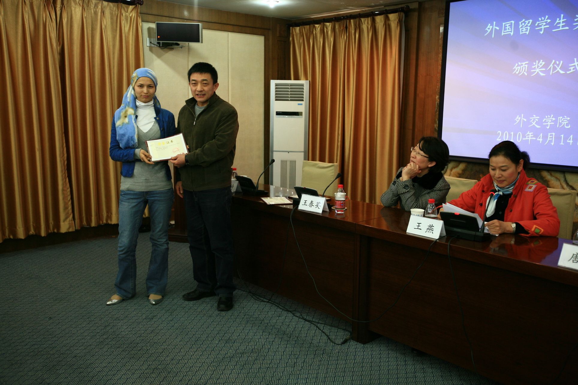 2010年4月14号,在外交学院国际交流中心1103教室举行了我院2009年度“北京市外国留学生奖学金”的颁奖仪式,外交学与外事管理系主任王春英教授、外事办公室王燕主任、研究生部唐晓主任、国际法系党总支书记崔峙和各专业的留学生参加了本次活动。我系共有16名同学获得一、二等奖。