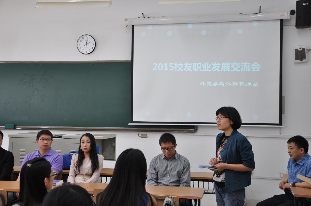 4月25日下午14:00,外交学系在沙河新校区115教室举办了2015年校友职业发展交流会。交流会请来了曾就读于外交学院外交学系的9位经验丰富的校友,讲述自己在职场路上的种种经历和感悟,与学弟学妹分享他们在求职、工作中的经验与教训,为许多对自己的未来感到迷茫的学弟、学妹们开拓求职视野,提供职场建议。交流会吸引了60多位同学参加。