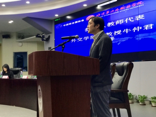 为参加此次比赛,我系自2017年1月起组队,并就相关知识进行具体培训与指导,特别是由一、二年级组队不仅丰富了学生的课外知识,也激发了同学们关注国际组织、未来立志服务于国际组织的理想愿望。本次比赛也受到了中国联合国协会的高度重视,5月6日,中国联合国协会会长卢树民大使专程来到现场,在开幕式上讲话,并亲临比赛现场倾听青年学子们对联合国知识的认知。联合国驻华总协调员罗世礼先生也来到比赛现场,并发表讲话,鼓励大家更多的研究联合国,关注联合国在国际事物中所发挥的作用,希望大家今后有机会为联合国工作。开幕式上,我系牛仲君副教授作为领队教师代表发言,他指出这次比赛不仅为同学们提供了很好的平台,能够让更多学生对联合国产生兴趣,未来投身到联合国组织工作中去,也将极大地促进联合国课程体系建设,是相互学习、相互借鉴的良好平台。