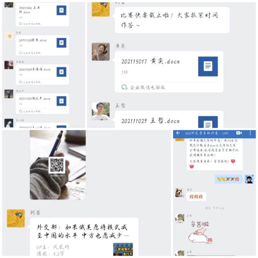 下午两点,活动主持人在企业微信群中公布题目,赛题涉及外交史、外交礼仪、时事要闻、理论知识等各个方面。题型也设计新颖,富于变化,包括趣味选择、外事puzzle、视频剖析三个部分。选手们通过问卷星与word文档形式作答,并在规定时间内将各自的独到见解发至群中,期盼着比赛结果出炉。