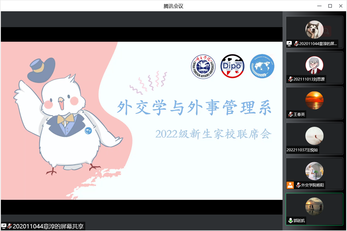 2022年9月3日下午两点,外交学系2022级新生家校联席会通过腾讯会议线上平台成功举办。本场家校联席会由外交学系辅导员杨阳老师主持,系主任王春英老师、总支书记郭延凯老师,全体新生与家长一同出席了此次家校联席会。