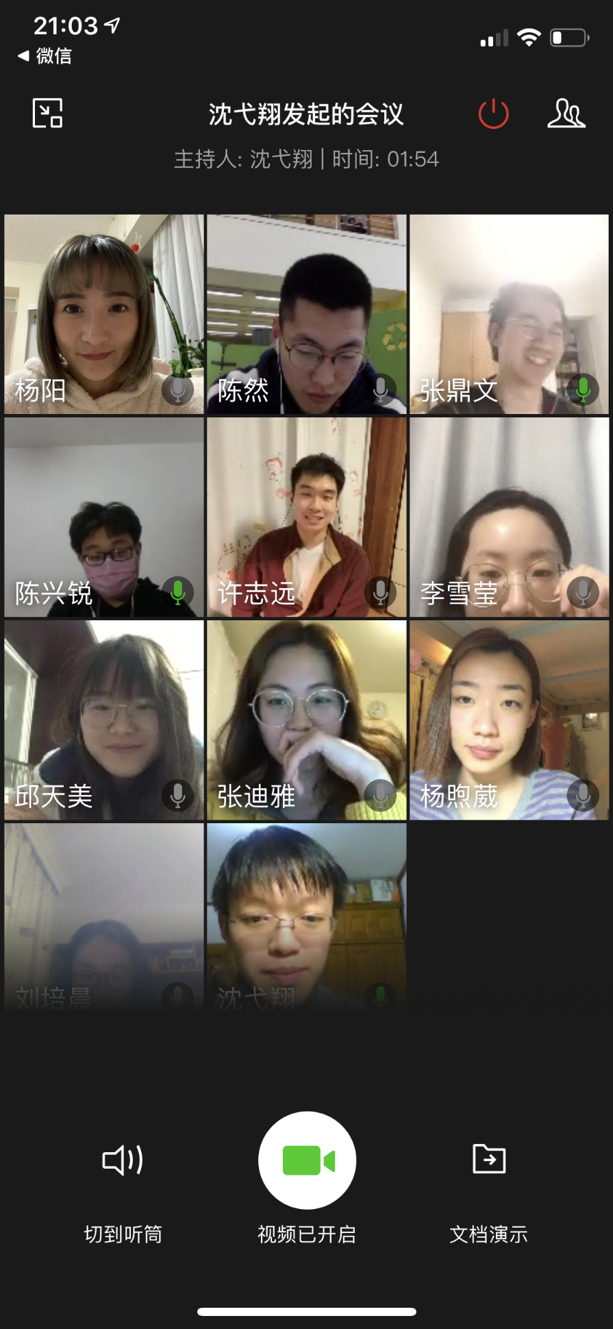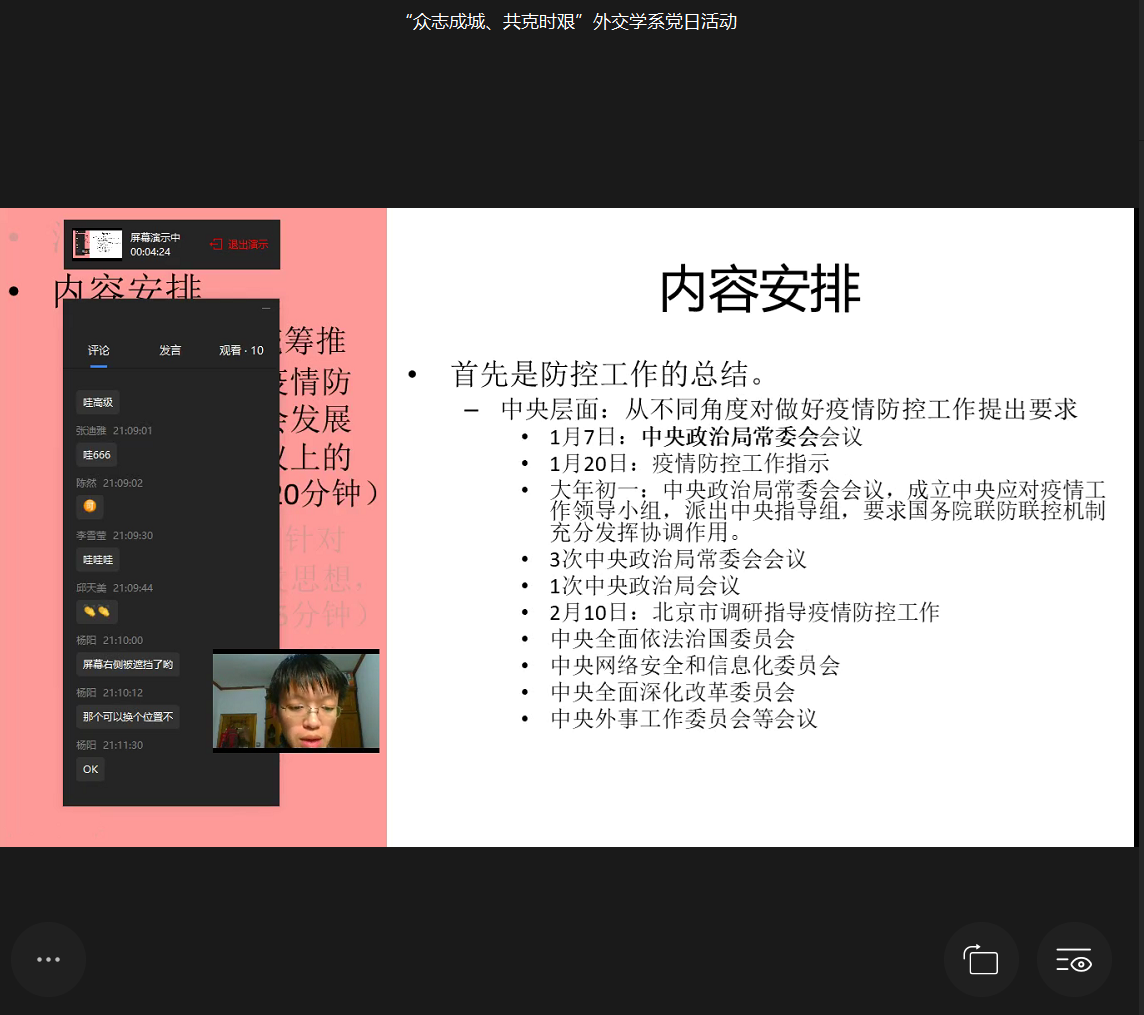 2020年2月25日晚21点,外交学系学生党支部全体党员在外交学系辅导员杨阳老师的带领下,以网络在线会议的方式,开展了“众志成城、共克时艰”主题党日活动,会议由沈弋翔同学主持。