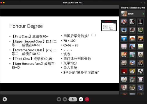 本次境外交流交换经验分享会解答了同学们关于交换学习与生活的疑问,使大一大二的同学们更进一步了解了交流交换政策、交换期间的情况。希望同学们在家上学期间规划好学习与生活,能够有计划地迎接新的学期。