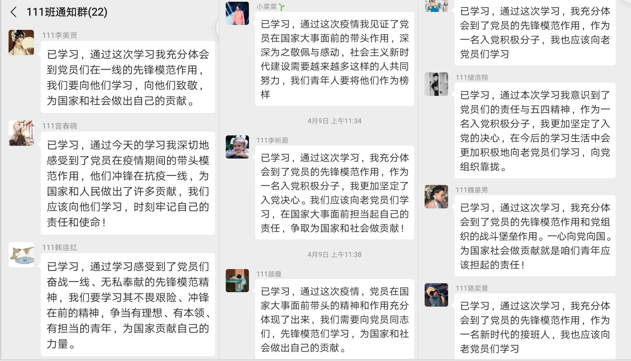 在”抗击疫情的党员模范“主题团课中,团支书向同学们作了关于新冠肺炎疫情的背景介绍,包括疫情传播特点、国内外疫情现状。随后,同学们通过阅读习近平总书记写给北大援鄂医疗全体“90后”党员的回信,深入学习了在抗击疫情过程中党员的先锋模范作用;通过金银潭医院院长张定宇、放哨人李文良医生等人的先进事迹,具体深入地学习了一线党员不畏艰险、冲锋在前的责任担当。此外,在团支书的带领下,同学们还围绕“为什么党员在一线”的问题进行了理论学习,深入理解党章中党员的义务,从而引导同学们以更加严格的标准要求自己。