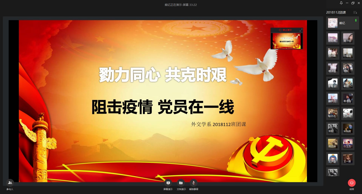 4月13-4月17日,外交学与外事管理系2018级111、112、113班分别在腾讯会议、zoom、微信群内召开了以“抗击疫情之中的党员模范”、“抗击疫情彰显中国制度优势”、“汇聚战胜疫情的全球合力”为主题的三次团课。