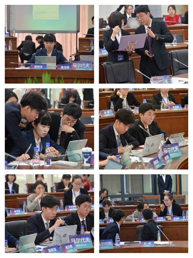 决赛中,我院代表队与中国人民大学、武汉大学、厦门大学、南开大学及暨南大学就气候变化与环境问题展开谈判交锋。作为本场谈判中地位极为特殊的马尔代夫国家代表,我方深入挖掘国家立场,积极扮演国家角色,真正立足所在国角度进行立场阐述及提案推进,掌握了整场谈判的主动权,成为决赛赛场上全场瞩目的焦点。