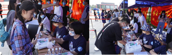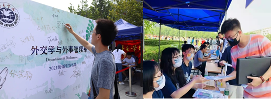 之后,新生们陆续来到伟人广场办理入学报到手续。在外交学系总支书记郭延凯老师、行政副主任郭冬梅老师、辅导员杨阳老师的带领下,外交学系学生会成员在伟人广场有序开展收档案、发材料的迎新工作。外交学系学生会的成员为新生们分发装有学生手册、学生证、校园卡等资料的文件夹,2021级新生在精心设计的背景板前签名、留影。