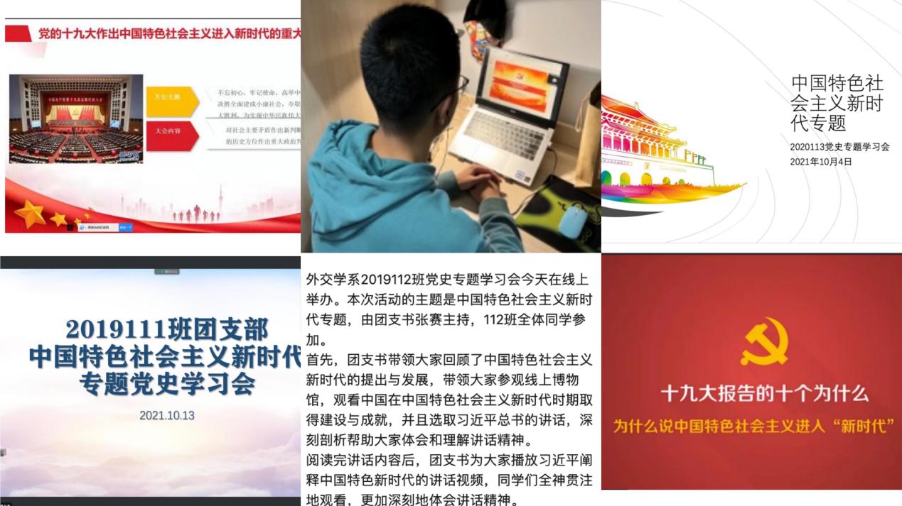 为响应部团委、校团委要求,进一步提高团总支内团员的思想觉悟和理论水平,坚定马克思主义信仰,从理论高度树立爱国爱党精神,激励团员青年们牢记使命、担当作为、为中国特色大国外交贡献力量,2021年10月,外交学与外事管理系团总支组织下属12个团支部开展以“中国特色社会主义新时代”为专题的党史学习会。