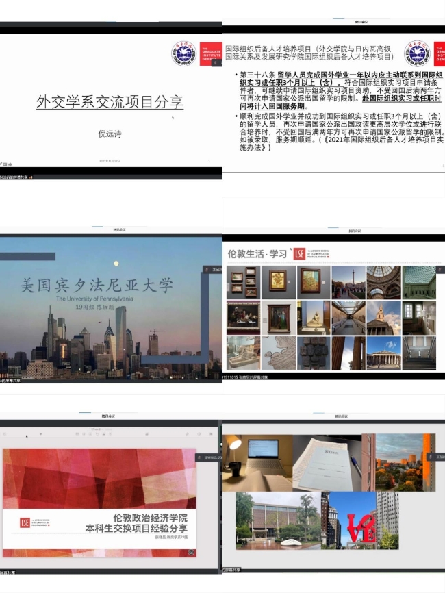 接着,三位优秀学生代表详细讲述了她们在国外的求学之路。就读于日内瓦高级国际关系及发展研究学院的倪远诗同学为大家介绍了国际组织后备人才培养项目、分享了学校的基本信息。就读于伦敦政治经济学院的张晓昱同学说明了申请学校所需的条件,与大家分享了在英国求学的生活经历。陈珈颐同学则梳理了自己出国交换的全流程,与大家分享了她在美国宾夕法尼亚大学学习生活的点点滴滴,让同学们得以更深入地了解留学生活。