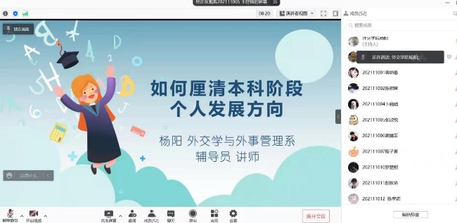 为帮助大一学生尽早规划个人发展方向,外交学系于11月29日晚6:30,举办了主题为“如何厘清本科阶段个人发展方向”的本科学业发展与生涯规划系列讲座。讲座由外交学系辅导员杨阳老师主讲。