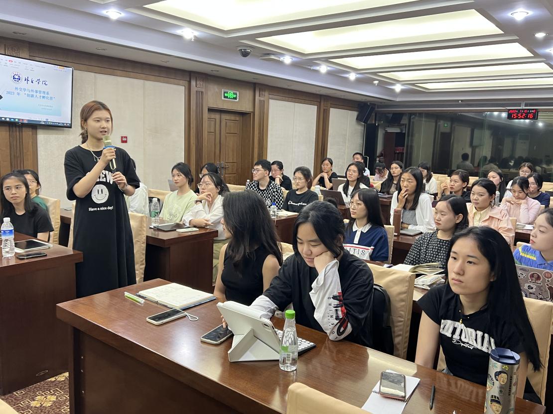 为了促进高校优秀大学生对外交学院以及外交学系的了解,选拔优秀大学生到外交学院继续深造,我系于2023年7月15日-17日举办了2023年创新人才孵化营,来自北京大学、暨南大学、浙江大学、厦门大学、南开大学、中国政法大学、中央财经大学、中国社会科学院大学、国际关系学院、北京语言大学等高校共35名大三学生参加了此次活动。孵化营活动主要包括专家讲座、大使讲座、校友交流会、模拟新闻发言人等特色活动。