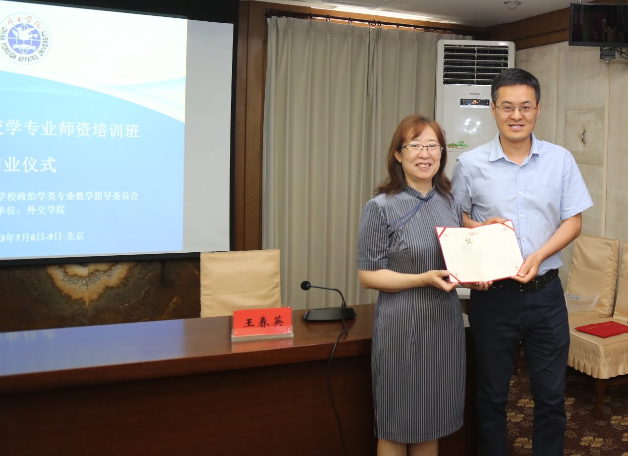 外交学院外交学与外事管理系系主任王春英教授为学员颁发结业证书