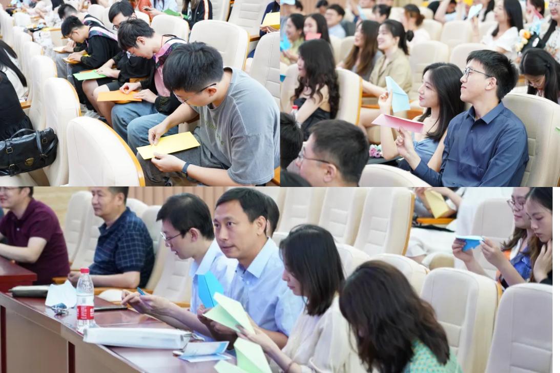 最后,毕业生和老师们共同制作了“童年的纸飞机”,象征着新的航行即将开始。大家拿着自己叠好的纸飞机来到图书馆报告厅门口,在“逐梦启航,志合山海”前,高喊着“我们毕业啦!”,将手中小小的纸飞机连同自己四年来的风霜雨雪、霞光灿阳,也连同对青春的恣意汪洋一起放飞,展望更美好的明天。